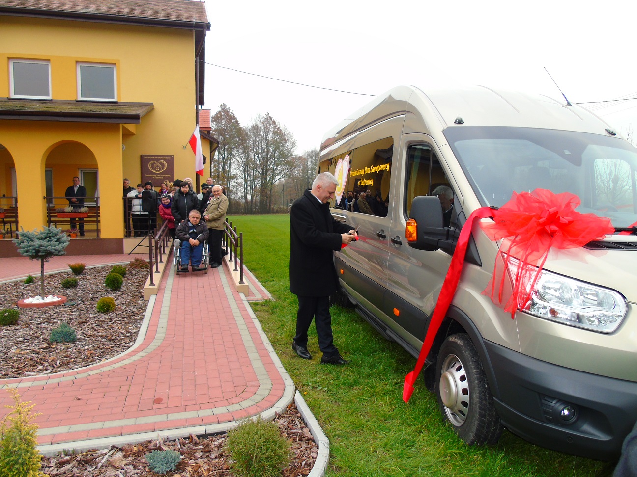 Co prawda nasi Uczestnicy dowożeni są nowym busem do placówki już od początku listopada, ale w dniu 09.11.2017r. nastąpiło jego oficjalne poświęcenie i przekazanie. Na tak wyjątkowym spotkaniu pojawili się przedstawicielie władz powiatu, gminy oraz sołectwa. Po przywitaniu i licznych podziękowaniach skierowanych w stronę gości nastąpiło przecięcie wstęgi, którego dokonali: Starosta Dabrowski – Tadeusz Kwiatkowski, Burmistrz Miasta i Gminy Szczucin – Andrzej Gorzkowicz, Przewodnicząca Rady Miasta- Przewodnicząca Rady Miasta, Ksiądz Prałat – Zygmunt Warzecha, Kierownik ŚDS – Maria Bielaszka, Prezes firmy TANKPOL – Roman Mosio oraz Prezes Stowarzyszenia „Otwarte Serce” - Bogdan Sosin. Aktu poświęcenia dokonał ksiądz proboszcz Parafii Szczucin – Zygmunt Warzecha.