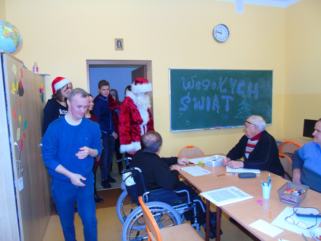 Tuż przed rozpoczęciem przerwy świątecznej – 21 grudnia 2018 roku naszą placówkę odwiedzili niespodziewani goście – Święty Mikołaj wraz z całą swoją ekipą i ogromnym workiem pełnym prezentów. Goście przybyli do nas z Zespołu Szkolno – Przedszkolnego w Borkach. Wszyscy nasi Uczestnicy zostali obdarowani słodkimi upominkami, a wizyta sprawiła im ogrom radości.