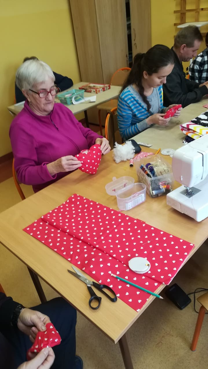 W związku ze zbliżającym się świętem zakochanych tematem przewodnim wykonywanych prac były właśnie serca walentynkowe. Uczestnicy w roli krawców spisali się znakomicie, właściwie co niektórzy minęli się z powołaniem ;).